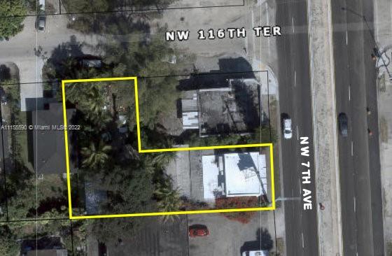 FANTASTIC LOCATION ON STATE ROAD 7 - NEAR I-95, GRATIGNY EXPRESSWAY - EASY TO ZIP NORTH TO BROWARD OR SOUTH TO DOWNTOWN. L SHAPED LOT THAT HAS 50' OF FRONTAGE ON THE EAST SIDE DIRECTLY ON 441 AKA NW 7TH AVENUE - 50' SECONDARY ACCESS ON THE NORTH SIDE AT NW 116 TERR. SOUTH SIDE OF THE PROPERTY IS 135' DEEP AND WEST SIDE IS 155'. PROPERTY CURRENTLY IS TWO STORIES WITH A 2/1 APARTMENT UPSTAIRS. FIRST FLOOR HAS A STOREFRONT, STORAGE, OUTER AND INNER OFFICE PLUS 1/2 BATH. THERE IS A FREE STANDING 1 CAR GARAGE. PROPERTY IS COMPLETLY FENCED AND CURRENTLY USED AS A PLUMBING SHOP - ORIGINAL OWNERS EXISTING LAND USE AS PER M-D: 110 - SALES AND SERVICES (WHOLESALE FACILITIES, SPOT COMMERCIAL, STRIP COMMERCIAL, NEIGHBORHOOD SHOPPING CENTERS/PLAZAS)